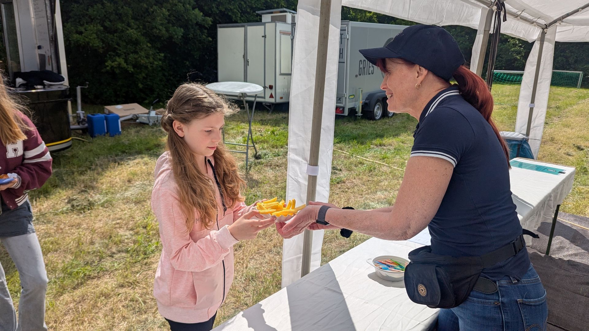 Am Stand wurden Bratwurst, Currywurst und Pommes Frites angeboten, je nach Wunsch mit oder ohne Brötchen. Zusätzlich gab es noch Überraschungseier und Schokoriegel für ganz eilige, meist jüngere Besucher. Die fleißige Crew hielt die Wartezeiten im erträglichen Rahmen, nur teilweise ausgebremst von den wie vorgeschrieben angemieteten Grill-und Frittiergeräten, die am großen Lob der Gäste jedoch nichts änderten.